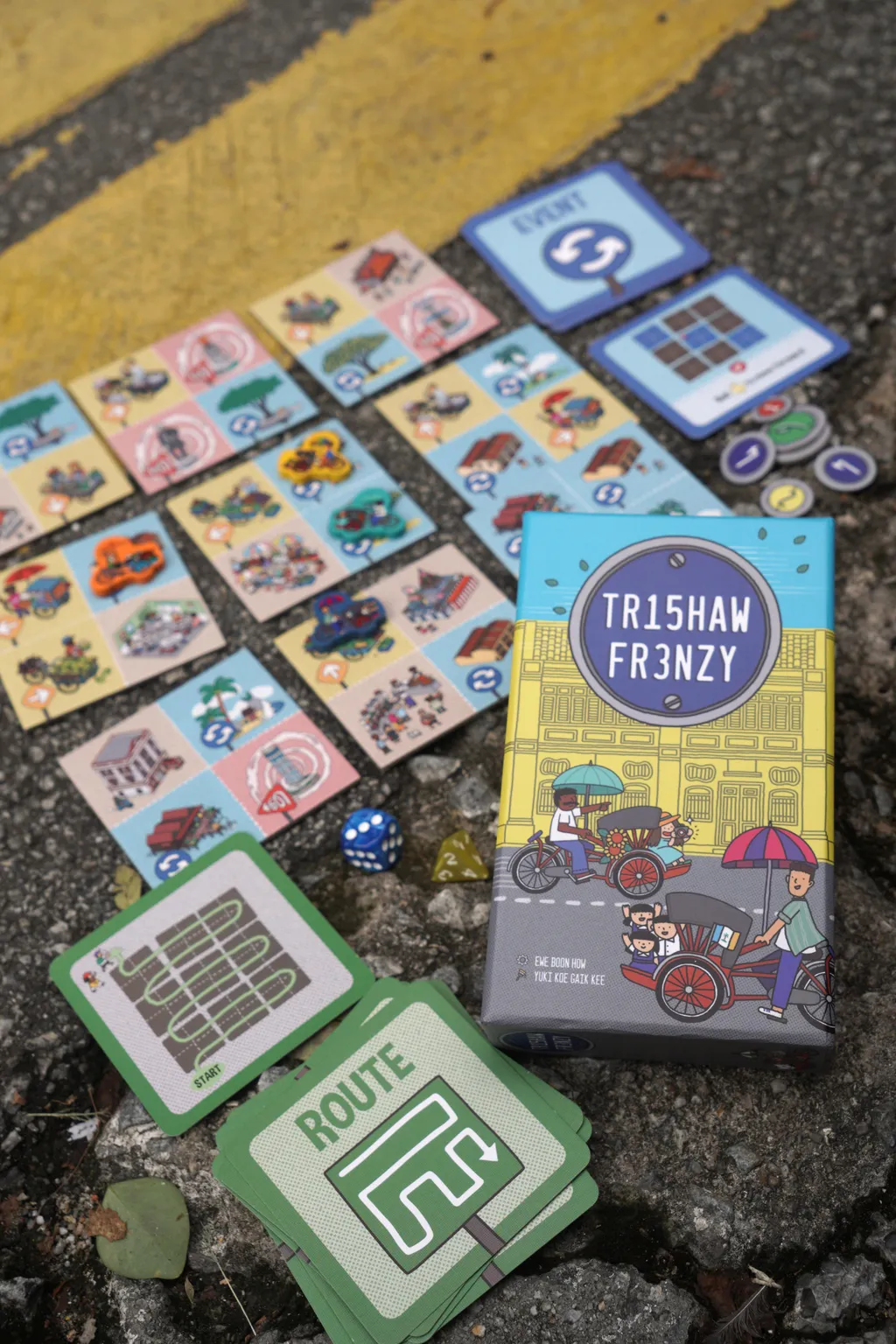 Players take on the role of trishaw riders who roll dice and race along a route of map tiles. Along the way, they encounter a series of events and chaos with their passengers-- map tiles sometimes get rotated, and the route sometimes gets changed altogether!