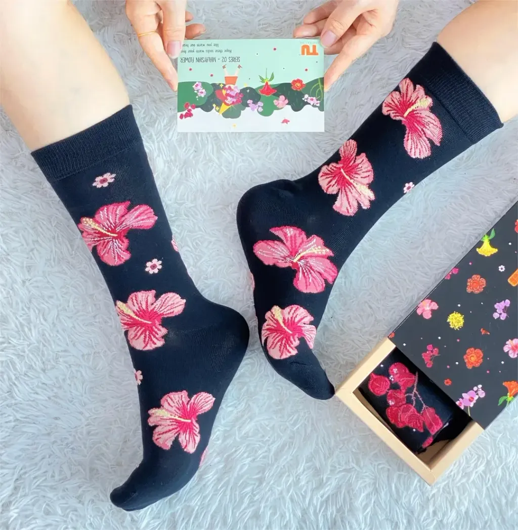 "Hibiscus" - Embrace the national flower of Malaysia with our Hibiscus socks. Featuring the iconic vibrant red petals of the Bunga Raya, these socks pay homage to Malaysia's rich botanical heritage. Crafted with a blend of comfort and style, they are a celebration of the country's natural beauty and tropical allure.